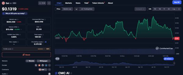 The market opened today with Sei trading at $0.1319, reflecting cautious sentiment across mid-cap altcoins. The token is currently 0.58% down in the past 24 hours, following a broader cooldown in trading activity.