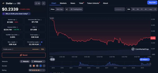 Stellar begins the week trading at $0.2310, reflecting renewed weakness across mid-cap assets as the broader market pulls back. Liquidity is rotating into high-volatility sectors, and analysts note that risk appetite remains selective following a series of sharp corrections.